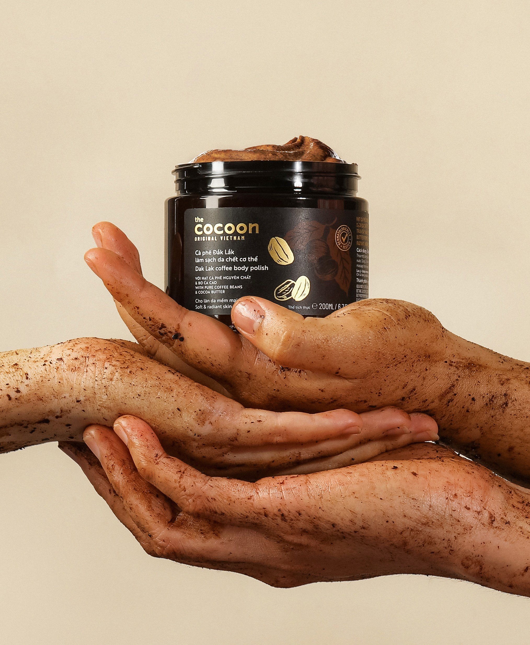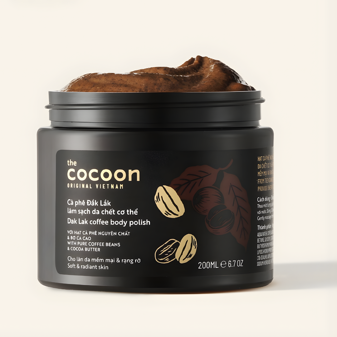 Hạt cà phê nguyên chất từ Đắk Lắk kết hợp với bơ ca cao Tiền Giang giúp làm sạch da chết cơ thể hiệu quả, làm đều màu da, khơi dậy năng lượng giúp da trở nên mềm mịn và rạng rỡ.